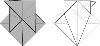 なんじゃそりゃ、という方が殆どだと思うので、簡単に説明しておきたいと思います。 「座布団小鳥の基本形」とは、文字通り「座布団折り」をしてから「小鳥の基本形」を折ったものです。 ありそうであんまり見たことが無く、且つ面白い形になるので、ここからなんでもいいので作品を作る。 というのが今回のお題なわけです。 ちなみに見た目はこんな感じになります。 表裏は気にせず使ってください。 なるべくこの基本形の原型を留めているのが望ましいですが、ここからスタートしたならとりあえずなんでもありです。 面白い作品が投稿されるといいなあ。 今年からはこんなお題も出せたら面白いかなあということで、ちょっとテスト的な意味もあります。 追記 あ、右の図の右上の三角、表裏逆だ。 更に追記 暗黒王子(闇)君が折図を書いてくれたみたいなのでリンク http://doblar.blog.shinobi.jp/Entry/41/