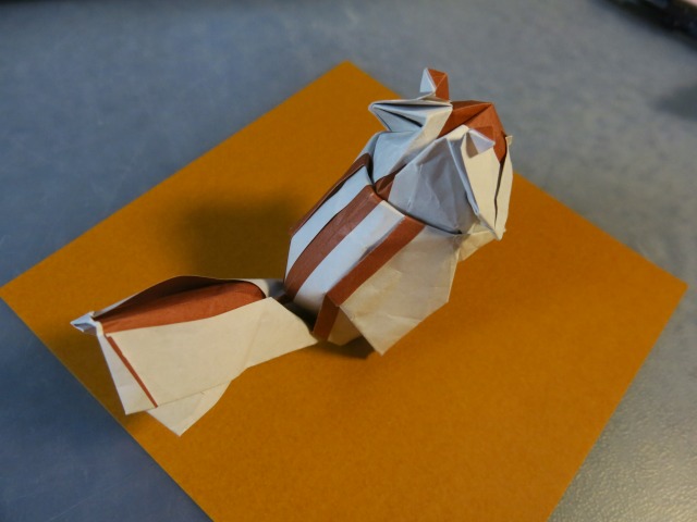 まず試作1匹目。発想としては、難易度の非常に高いシマリスの背中の模様をインサイドアウトで出す。そしてその目的を達成するために複数枚を使うということと、以前から試してみたかった重ね折りを合わせて実践するというものでした。