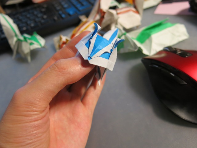 試作2匹目。ほぼ1匹目の折り直しですが、なんとか顔が可愛くならないかと努力しました。