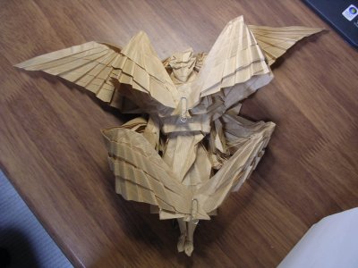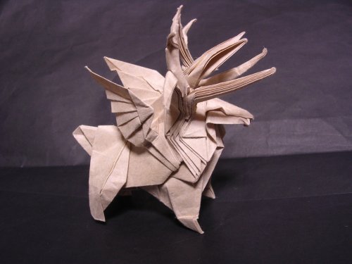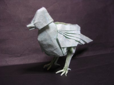 興奮してるのかな。 基本構造は同じ。単純に隠れていた紙を引っ張り出しただけだという。前作はいったいどれだけ無駄になっていたのかという話。 さて、なんだか見た目は格好良いけど、でもこれは明らかにウサギじゃないな。 相変わらず後頭部付近の紙の厚みがすごいです。こればっかりはどうしようもないけど。 そもそも最初はお題「神話の生物」だったときに思いついたんだけど、よく考えたらこいつはUMAであって神話に出てくるわけではなかったとい悲しい話が。 今まで何種類も鶏を折ってきたけど、納得できるような作品には、まだ近づけてもいない気がする。 そう思うのは単純に鶏が好きだからかもしれない。 とりあえず白色レグホンを折りたい。そこから鶏の種類の折分けをw ちなみに某人曰く、この尾はこれ以上弄ってはいけないらしい。 -余談- 「鶏飼ってたんだ」 と、友人に言うと 「へえ、でもそれって食べる時辛くない?」 なんて返事が返ってくることがあるのだが、やはり一般的な認識では鶏は食料以外の何者でもないのだろうか。 そのときの俺の心境は、犬を飼っている人が「その犬食べる時辛くない?」と聞かれたのとたぶん同じで、こいつ何言ってんだって感じだったわけだけど。