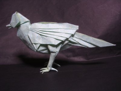 興奮してるのかな。 基本構造は同じ。単純に隠れていた紙を引っ張り出しただけだという。前作はいったいどれだけ無駄になっていたのかという話。 さて、なんだか見た目は格好良いけど、でもこれは明らかにウサギじゃないな。 相変わらず後頭部付近の紙の厚みがすごいです。こればっかりはどうしようもないけど。 そもそも最初はお題「神話の生物」だったときに思いついたんだけど、よく考えたらこいつはUMAであって神話に出てくるわけではなかったとい悲しい話が。 今まで何種類も鶏を折ってきたけど、納得できるような作品には、まだ近づけてもいない気がする。 そう思うのは単純に鶏が好きだからかもしれない。 とりあえず白色レグホンを折りたい。そこから鶏の種類の折分けをw ちなみに某人曰く、この尾はこれ以上弄ってはいけないらしい。 -余談- 「鶏飼ってたんだ」 と、友人に言うと 「へえ、でもそれって食べる時辛くない?」 なんて返事が返ってくることがあるのだが、やはり一般的な認識では鶏は食料以外の何者でもないのだろうか。 そのときの俺の心境は、犬を飼っている人が「その犬食べる時辛くない?」と聞かれたのとたぶん同じで、こいつ何言ってんだって感じだったわけだけど。