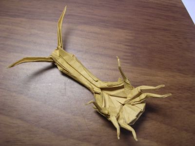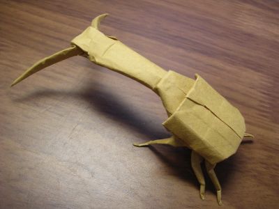 前の記事で書いた「ファーストヴィンテージ」で何か折ってみたいけど 折るものが思いつかず悩んでいたら、そういえば過去の記事で造形だけ決めて 本折りしていないこいつがいたじゃないかと思い出した。 ファーストヴィンテージ 43kg 四六判 80円 ヒゲナガオトシブミ サイズ:約24×24㎝ 出来上がりが10㎝くらい。 首の細さは再現するより、折紙的なラインをできるだけ尊重したデザインにした。 以降紙の考察。でも折れもそんなに紙の種類折ってるわけじゃないので、参考までに。 結構細く折りこめたので、無茶作品じゃなければかなり対応できると思う。 何度も折り直したりして指で擦れると、クラフト紙っぽい皺がちょい寄る。 中々面白い色がある。 今回は三色一枚ずつしか買ってないけど、今度全色買ってこよう。