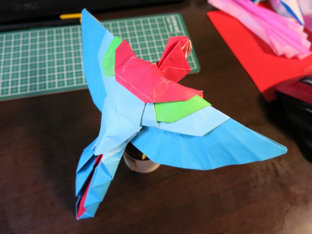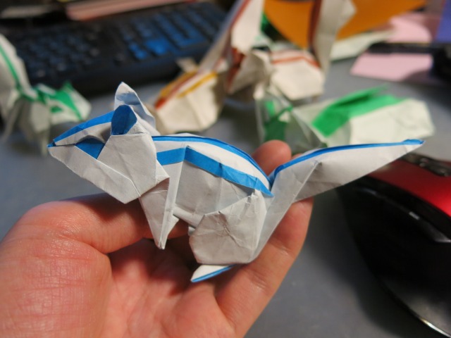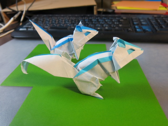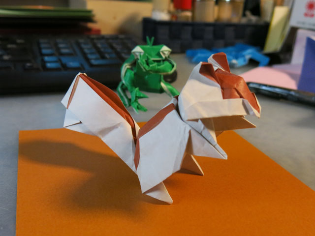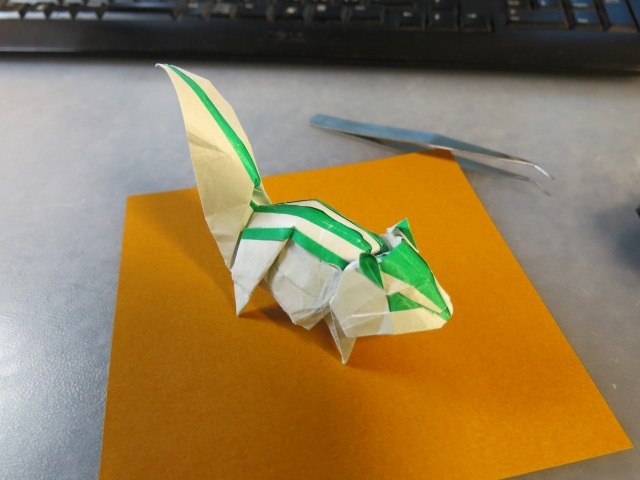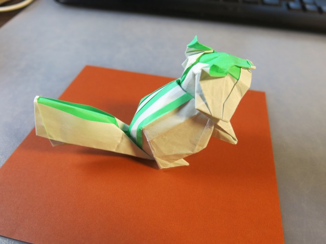 × [PR]上記の広告は3ヶ月以上新規記事投稿のないブログに表示されています。新しい記事を書く事で広告が消えます。 現在の品種改良されたニワトリの原種の一つとされる野鶏(ヤケイ)の一種です。 このニワトリをヘッドパーツとして、4枚の正方形から、不足部分を補うというコンセプトではなく、1枚折りではどうひっくり返っても限界となる"色の数"を達成するための複合作品として制作しました。 紙はカラペラピスを全色である4色とも使っています。 Twitterで画像を流しながら開発していたシマリスが一応の完成を迎えたので、まとめます。 まず試作1匹目。発想としては、難易度の非常に高いシマリスの背中の模様をインサイドアウトで出す。そしてその目的を達成するために複数枚を使うということと、以前から試してみたかった重ね折りを合わせて実践するというものでした。 試作2匹目。ほぼ1匹目の折り直しですが、なんとか顔が可愛くならないかと努力しました。 3匹目。これがうまくいきました。 5匹目。この間にほぼ同じものをもう一匹作って試しています。 6匹目。二枚重ねで、且つそれらの紙を「まとめて折る必然はない」というところから、尻尾の根本の位置を変えたことで目的の尾を長くすることに成功しました。 というわけで、このような形にまとまりました。 |