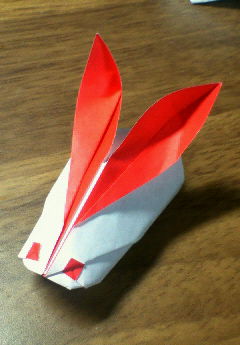 折り手順が非常にスムーズなため、折っていてとても気持ちがいい。完成度高し。 一時間ほどで作品ができあがったので、ささみ君はもう一つ講習をやることになり、トンボとうさぎを取り出してどっちがいいかと問う。結果、うさぎになった。 ささみ「皆トンボに見えないって言うんだよ、僕としてはこれはすごくトンボなんだけどなあ・・・」 ちょっと切なかった。 ちなみに俺は作業をしていたため、うさぎは折っていない。