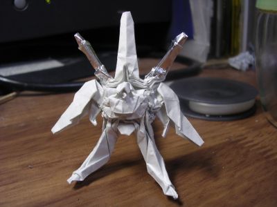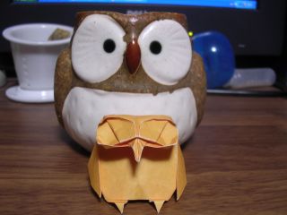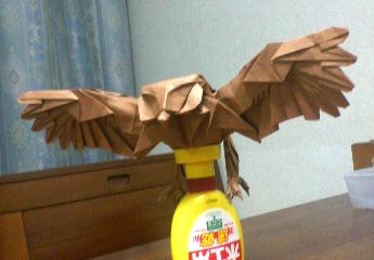 新作発表は・・・すいません。覚えてないです。 とりあえず俺はペガサスを出した。でっちあげ作品だが。 その後は例会終了まで、そしてその後もいつものメンバーでぺちゃくちゃと。 しかし俺は学校があるのでそのまま大学へ、まだ履修期間の授業なので軽く40分ほどで終了。まあ多少反則技は使ったが。 連絡をとると皆で飯を食っているらしいのでそのままその店へ。そこで何故か盛り上がる顔折り大会。何だこれ。皆個々に、思うがままに顔を折り始めたのは何でだったか、というかこの怪しさ128%の集団はいったい何者だ。 そこにいた人間にしかわからない話だが、顔折りの新たな可能性が広がったりもした。さあ、どうなるか。 と、楽しい時間は早いもの、最後の方は皆しゃべりもせず折っていた気もするが、適当に時間を見極めて解散。 そんなこんなで次のお題が「顔」になったのであった。ってまだお題変えてないじゃないか俺。 フクロウ本折り完了。 と、言っても例会で出しただけなのでネット上では初公開ですが。 羽根を広げて横の長さが30㎝。おおでかい。俺の作品の中では一番でかいかもしれないw 20等分蛇腹で、最初蛇腹で簡単にできるフクロウの顔の折り方を思いついたので、以前試作だけしていた蛇腹翼と合わせてみました。 この羽根はパーツとして他にも流用できるでしょうね。うん、しよう。 ちなみに例会のときに24等分とか言っちゃいましたがそれは普通に間違いました。すみません。