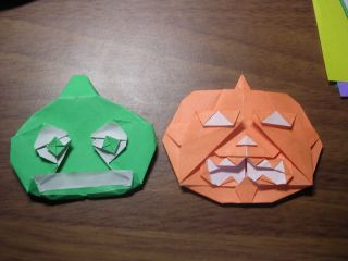 それで、いつもこんな感じ。 他人の作品もあるのでえーと アジア象:神谷哲史:講習してもらった アライグマ:ジョン・モントロール:をる7号 まつばぼたん:山口さんの本だけど作者山口さんだっけ?:花のおりがみ キティちゃん:うーん誰だったか、調べておきます:月刊おりがみのどれか 適当にこの辺の作品とオリジナルがローテーション。あとは川崎ローズとかそこら辺。 ああ、恵まれたバイトだと思うよ。 右が10月の例会でささみ君が講習したというかぼちゃランタンです。 正式な作品名称は「Jack-O-Lantern」だそうで。 今ささみストリートで折り方を公開中なので要チェックや そうだアドアドhttp://sasamistreet.blog23.fc2.com/ リンク機能もあるんだから使わなきゃ。 ところでふと思ったんですがNHKの「ぐ~チョコランタン」のスプーはこれが元ネタ・・・とか思ったんですが調べたら全然違いますね。いや、あのスプーの印象が強すぎたんですよ。うん。 言ってる意味がわからない人はスプーでググれ。